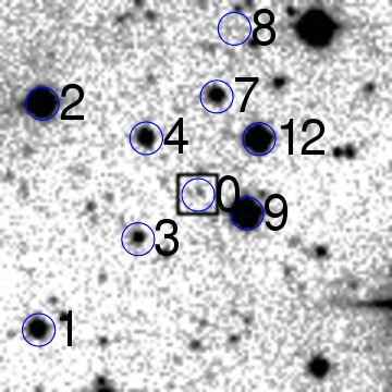 Pre-discovery 5' Catalina Sky Survey coadd image (transient location marked with 0)