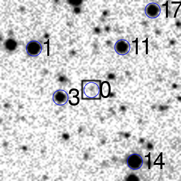 Pre-discovery 5' Catalina Sky Survey coadd image (transient location marked with 0)