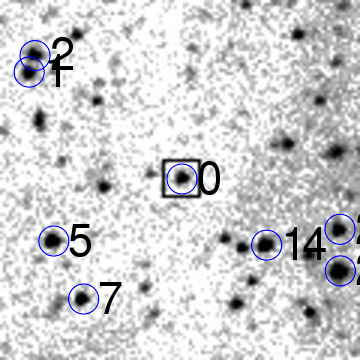 Pre-discovery 5' Catalina Sky Survey coadd image (transient location marked with 0)