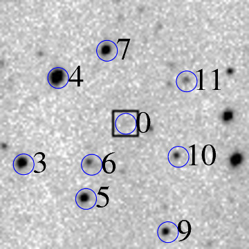 Pre-discovery 3.6' Siding Spring Survey coadd image (transient location marked with 0)