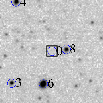 Pre-discovery 3.6' Siding Spring Survey coadd image (transient location marked with 0)